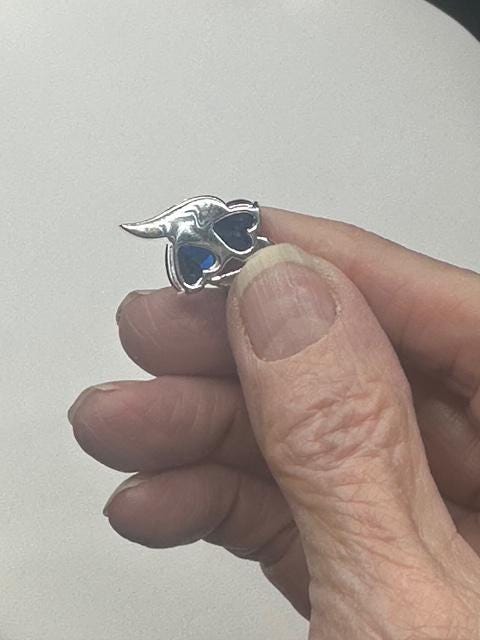 These double heart with blue stones are a unique way to hold a loved one close. This pendant can hold a small amount of cremains, lock of hair, or dirt from the sacred burial grounds. This piece comes on an 18" matching chain. 3/4 inch