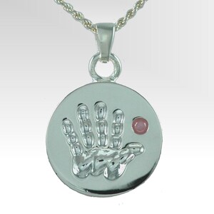 This beautiful round with pink handprint is a unique way to hold a loved one close. This pendant can hold a small amount of cremains, lock of hair, or dirt from the sacred burial grounds. This piece comes on an 18" matching chain. 3/4 inches in size engraving Please enter EXACTLY what you would like engraved on the pendant