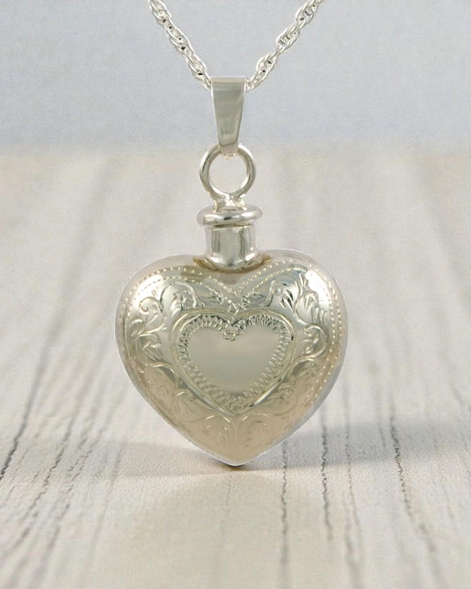 Etched Heart Cremation Urn Necklace: Sterling Silver Memorial Jewelry