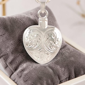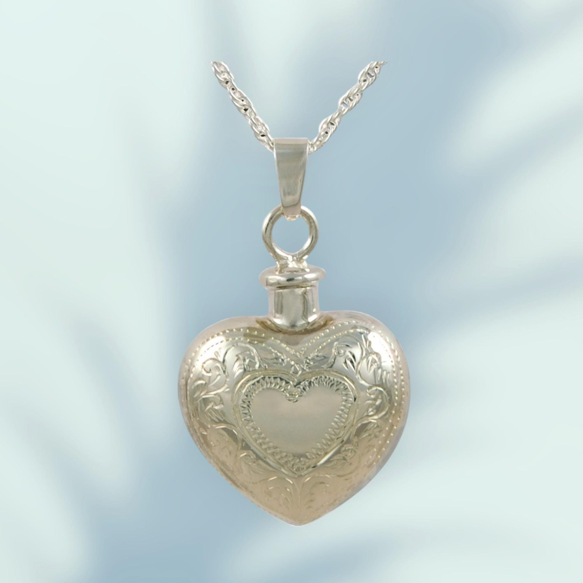 Double Etched Heart Cremation Urn Necklace: Sterling Silver Memorial Jewelry